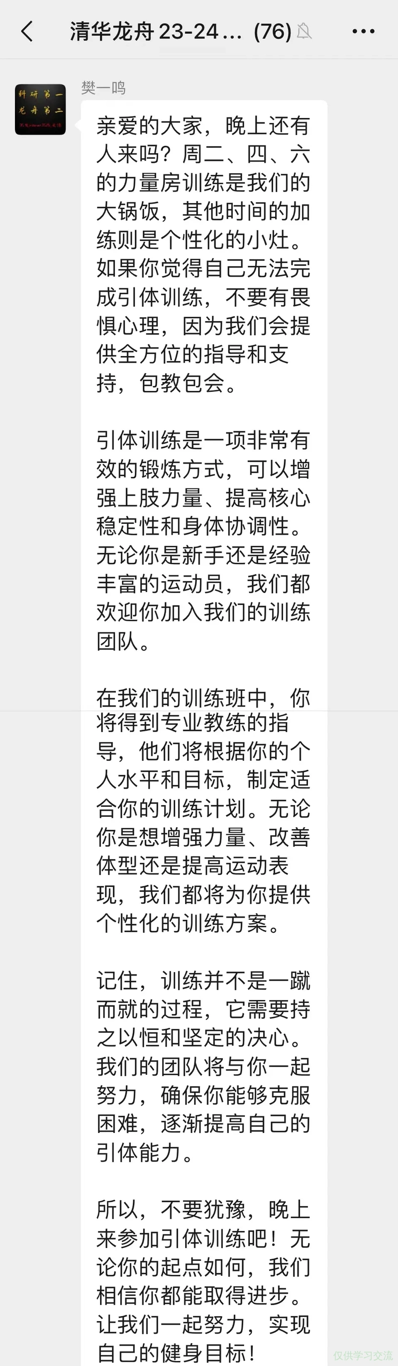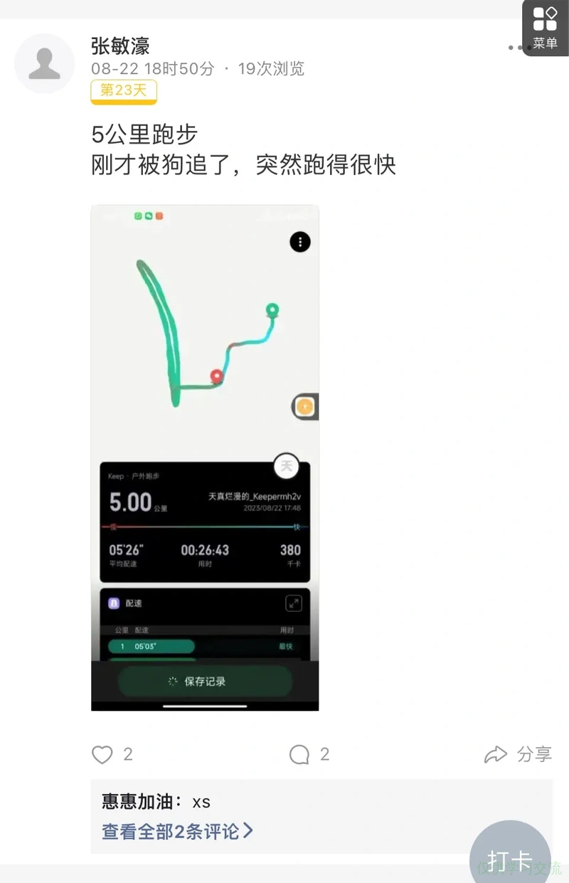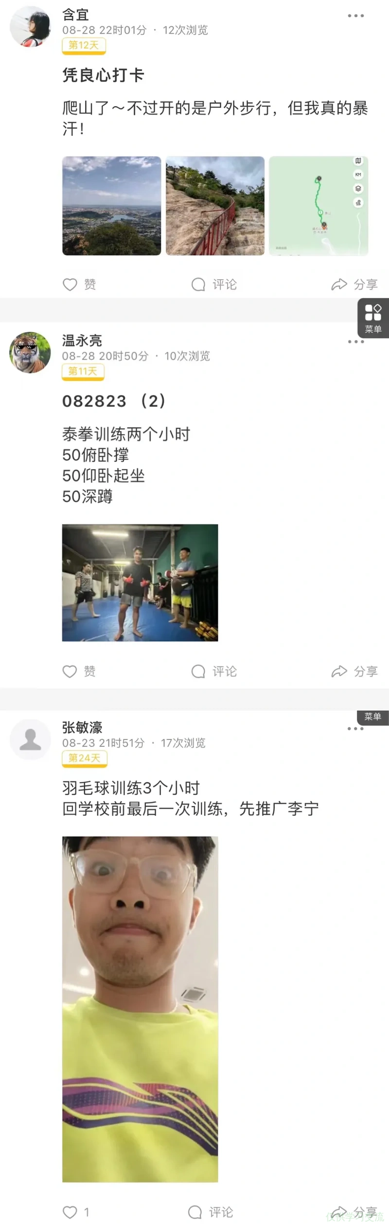 总体来说,我对咱们的暑训还是比较满意的,虽然暑假有人回家、有人做实验、有人在军训,但每次训练都能召集十多个成员。有时候个别成员确实来不了,还会自己利用身边的资源完成健身打卡。比如有同学回印尼打泰拳,有同学去爬山,有同学打羽毛球。这种随地运动的精神很值得我们学习。