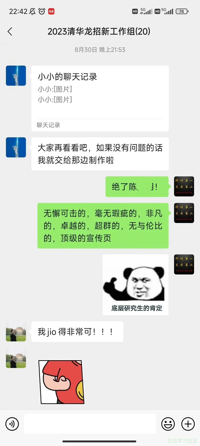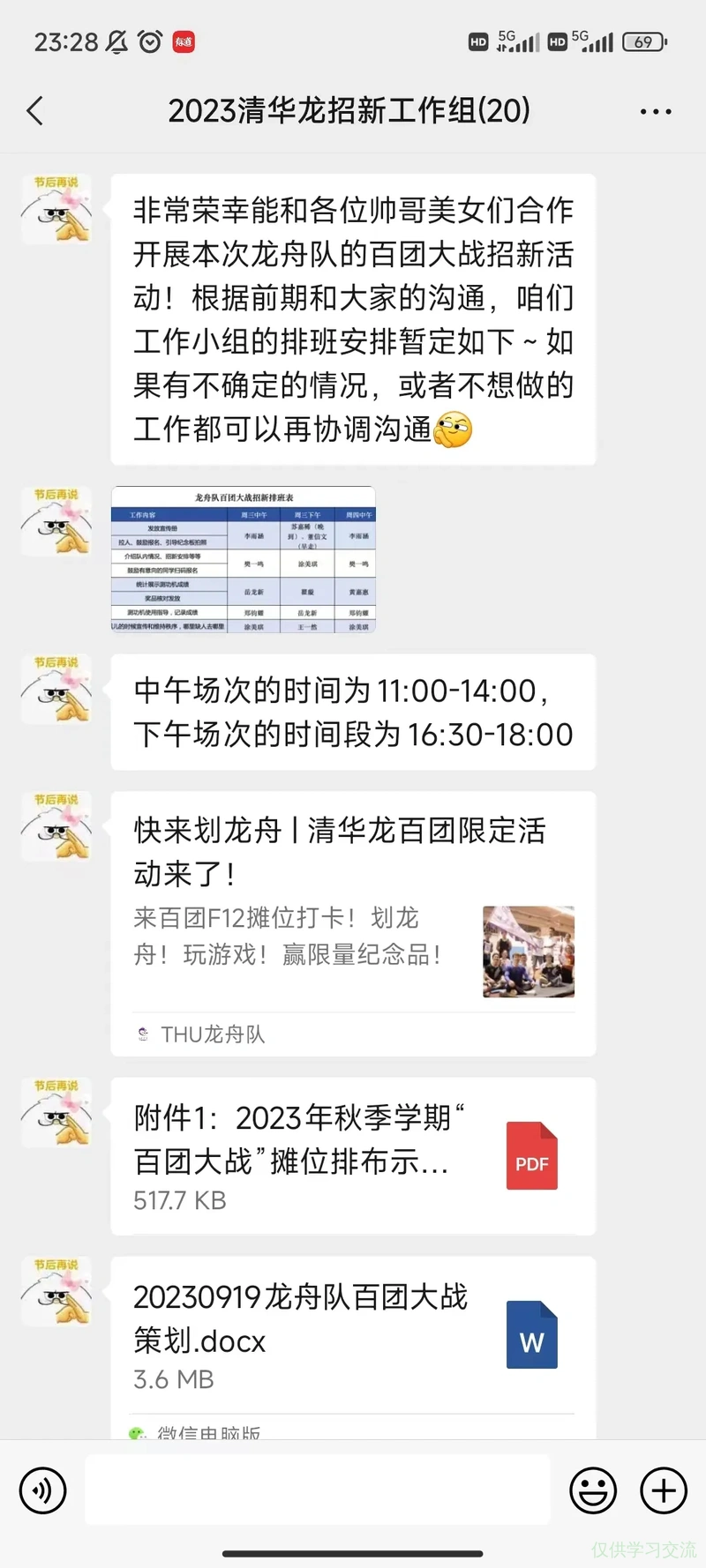 总之,在招新工作组的不懈努力下,今年的大群总人数来到了史无前例的220+,新同学中还有不少各兄弟院校龙舟队输送来的优秀人才,如来自东南大学龙舟队的SGX, ZST、来自中山大学龙舟队的LQY、来自复旦大学龙舟队的WYR、来自同济大学龙舟队的WZ、来自武汉大学龙舟队的LKY、来自清华大学深研院龙舟队的前队长LS,可谓藏龙卧虎、百家争鸣,期待未来的清华龙在新老队员的不断奋进下登上更高水平的舞台!